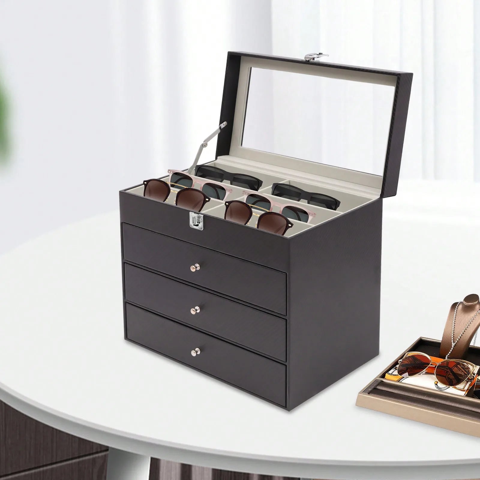 4 Layer 27 Slots Black Sunglasses Organizer Case with 6 Watch Box and Jewelry Case for 18 Eyeglasses Storage and Display