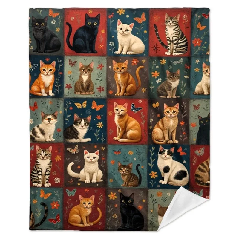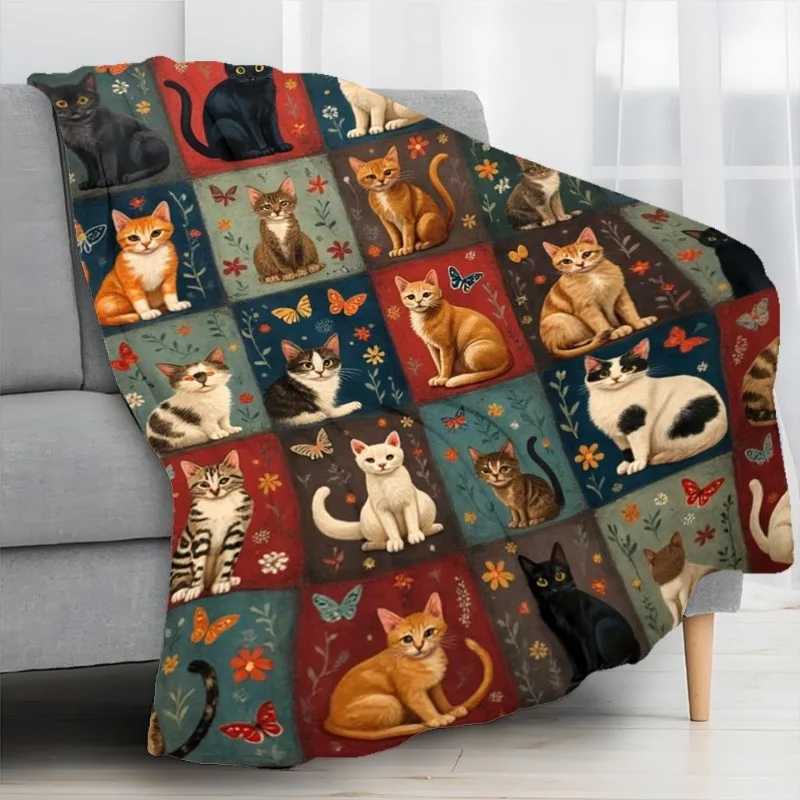 Comfortable flannel patchwork cat and floral tiger print blanket - All season sofa bed travel blanket - Colorful retro blanket