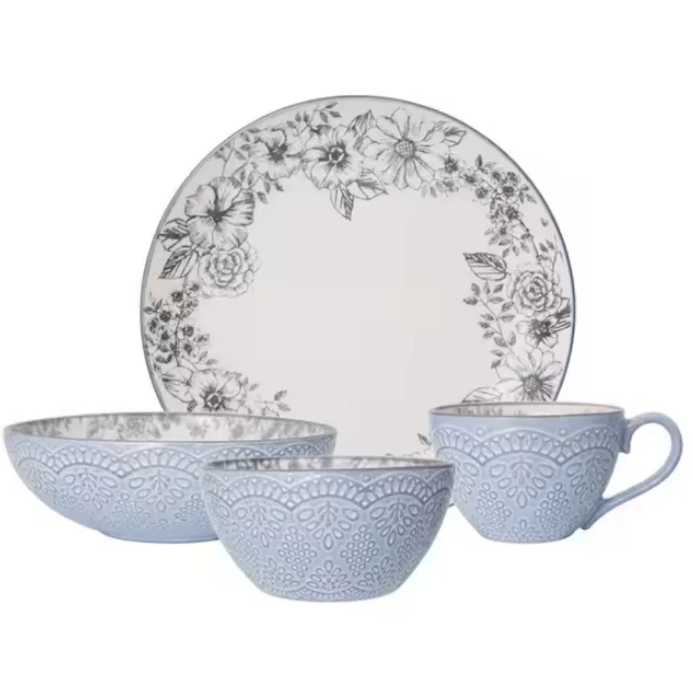 Crafted of Stoneware, featuring a reactive glaze. Due to the nature and hand-crafted qualities of reactive glaze, no two-Pieces are exactly alike and will exhibit unique variations in color and pattern. Product may slightly differ from image shown. This 16-Piece dinnerware set, service for four, includes (4) each: 10-1/2 in. dinner plate, 6 in. (26 oz.) soup cereal bowl, 8 in. (34 oz.) pasta bowl and 12 oz. mug. Microwave and dishwasher safe.