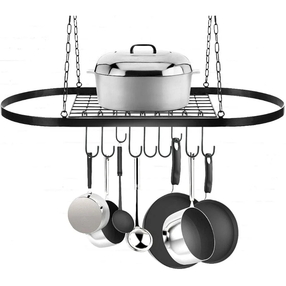 🍳【MULTIPLE HANGING WAYS】This pot and pan stand is equipped with a ceiling bracket, which gives you a variety of hanging options. Plus, it comes with a shelf that can be used to store recipes, spices, bowls, lids or other bulky, impossible-to-hang items and other decorations.